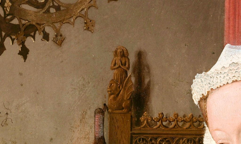 Sur le cadre du lit se trouve une sculpture de sainte Marguerite, la patronne des accouchements. Il s’agit donc d’un portrait d’un mariage heureux et fructueux à venir, n’est-ce pas ?