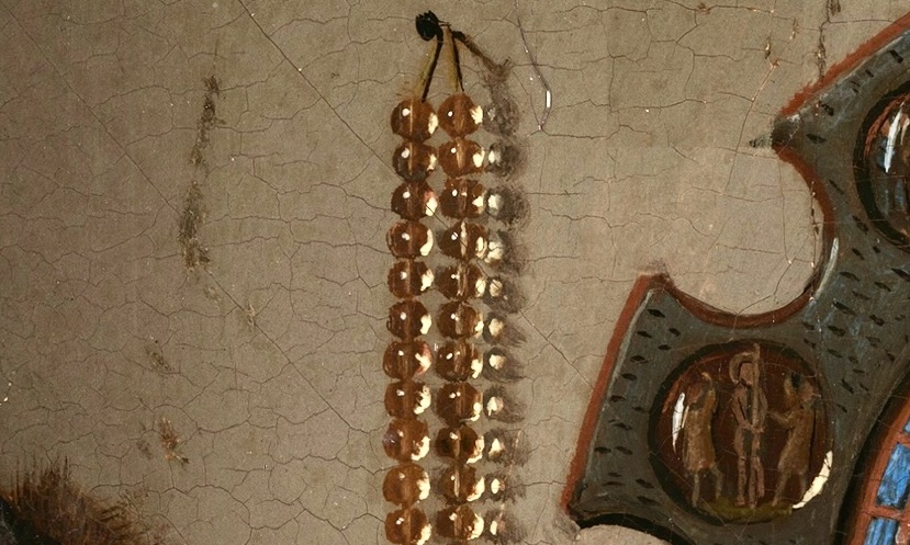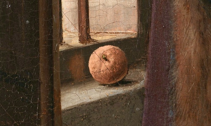 Prenons aussi cette orange, elle-même symbole de richesse puisqu’elle a été importée à grand frais à Bruges (où elle a été peinte). Son ombre est magistralement rendue, mais elle a même un léger reflet dans le rebord de la fenêtre.