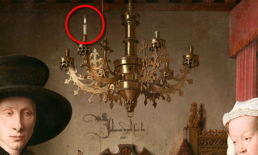 Mais si l’on creuse davantage les symboles, on comprend pourquoi il s’agit de l’une des peintures les plus analysées de l’histoire. Tout d’abord, certains pensent qu’il s’agit d’un véritable contrat de mariage, ce qui explique la présence de la signature de l’artiste comme témoin [Johannes de Eyck était ici, 1434].