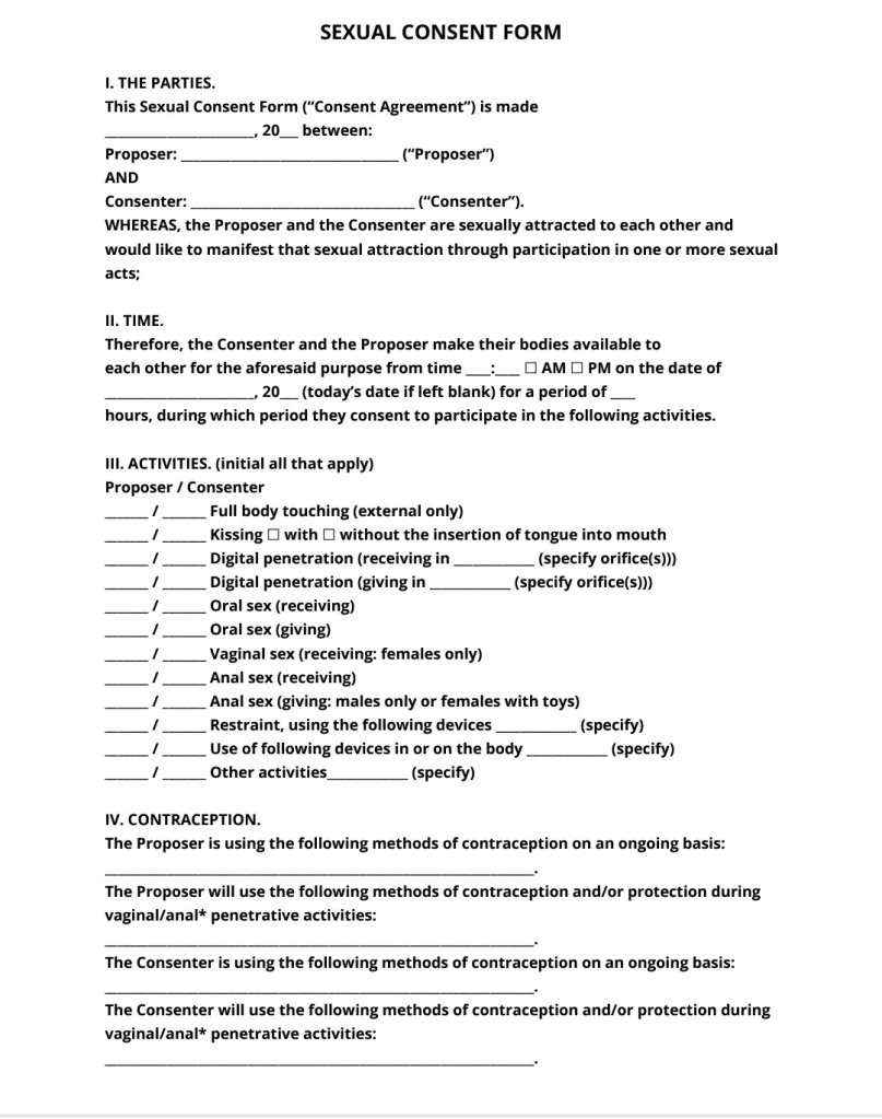 Le contrat est très détaillé : les pratiques admises doivent être cochées (baisers, pénétration, sexe oral ou anal, utilisation d’objets…), les heures doivent être spécifiées, tout comme le type de contraceptif à utiliser relativement à quelle pratique. Celui qui « propose » l’acte doit en outre expliquer ses raisons pour chaque choix de contraceptif relativement à chaque pratique. Et si quelque chose n’est pas convenu dans l’accord, il faudra en conclure un nouveau. Toujours sous le regard d’un témoin qui doit lui aussi apposer sa signature.