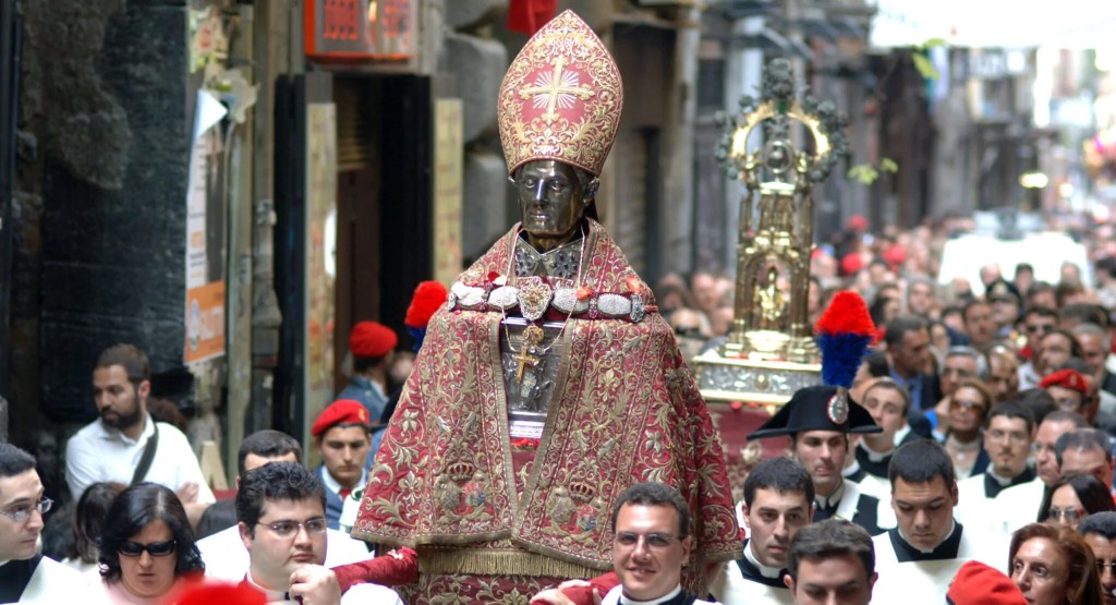Dans l’île d’Ischia vivait la très sainte veuve Maxima, dont le fils avait succombé à une terrible maladie. (…) Alors que le corps gisait sans vie, et que les clercs préparaient les obsèques, ils ne purent trouver nulle part de linceul, parce que le peuple des Gaules avait tout pillé ; ils durent donc prendre dans une église une tenture pour pouvoir couvrir le corps. La femme, apercevant dessus l’effigie du très bienheureux Janvier, s’en saisit, la serra entre ses mains, effleura l’image peinte d’un baiser, l’implora et cria ainsi : « Au nom du Roi des saints, je te conjure, très bienheureux martyr Janvier, de daigner me soulager de mon malheur, afin que je puisse par ton intercession retrouver mon fils, parce qu’au nom de ta Passion tout ce que tu demanderas à Celui qui, autrefois, mû par la miséricorde, a ramené à la vie le fils unique d’une veuve, peut t’être à présent accordé. » Disant cela, elle couvrit promptement son fils de la tenture qui avait été amenée et sur laquelle était l’image du très bienheureux martyr Janvier, faisant correspondre le visage de l’image à son visage, posant les yeux sur les yeux, la bouche sur la bouche, les mains sur les mains et les pieds sur les pieds. Elle avait en effet entendu dire dans les saintes Écritures comment le bienheureux Elisée avait ramené à la vie le fils unique de la Sunamite, et, en outre, que celui que touchait l’ombre des saints était rendu à la vie. Quelles oreilles sont si dures, quelles entrailles taillées dans la pierre au point de pouvoir entendre de telles choses sans verser de larmes ? Mais Celui qui, miséricordieux, pourvoit à tout l’entendit s’écrier ainsi et sangloter des prières assidues et, afin de chasser le chagrin de la mère, sur la supplication du bienheureux Janvier, rendit la vie au fils ; celui-ci ouvrit les yeux et se releva en parfaite santé de sous l’effigie du martyr.