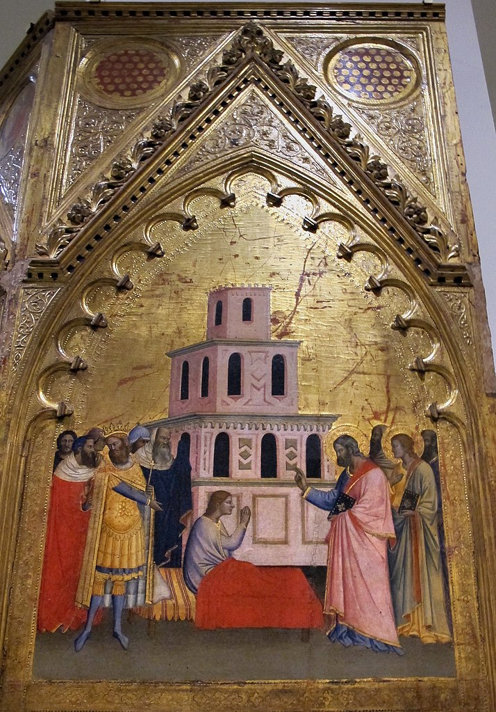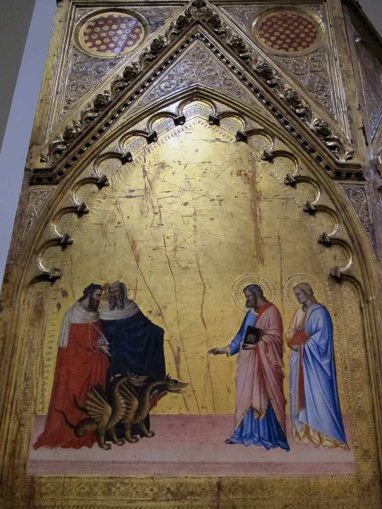 En 1367, la guilde des changeurs florentins commande au peintre Andrea di Cione, plus connu sous le surnom d’Orcagna, un triptyque de leur saint patron, l’apôtre et évangéliste Matthieu. Orcagna, qui dirigeait alors l’un des ateliers artistiques les plus actifs de la ville, tomba malade au cours des travaux et laissa à son frère Jacopo le soin de les achever lorsqu’il mourut l’année suivante. L’emblème de la guilde se trouve en haut des deux panneaux latéraux, au-dessus des pinacles.