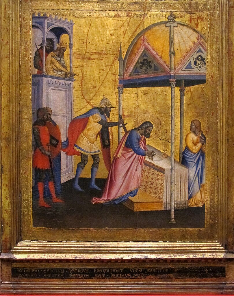 À Égippe succède son frère Hirtacus, qui se retourne contre le christianisme et fait tuer saint Matthieu sur l’autel alors qu’il venait de célébrer la messe, comme on le voit sur le quatrième panneau. Iphigénie, que l’on voit en bas à droite, est encore nommée aujourd’hui dans le martyrologe traditionnel du rite romain.
