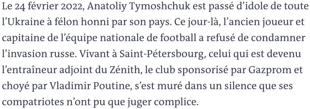 Aujourd’hui « traître » à l’Ukraine alors qu’il est simplement passé de joueur à entraîneur du Zénith, il a été en Ukraine déchu de tous ses titres, rayé de ses 144 sélections nationales, enlevé du registre des joueurs. Dans la plus pure tradition soviétique. Même les contempteurs occidentaux de Tymochtchouk conviennent que ces mesures n’ont aucune valeur légale. Mais c’est ça, l’Ubukraine de Zelensky.