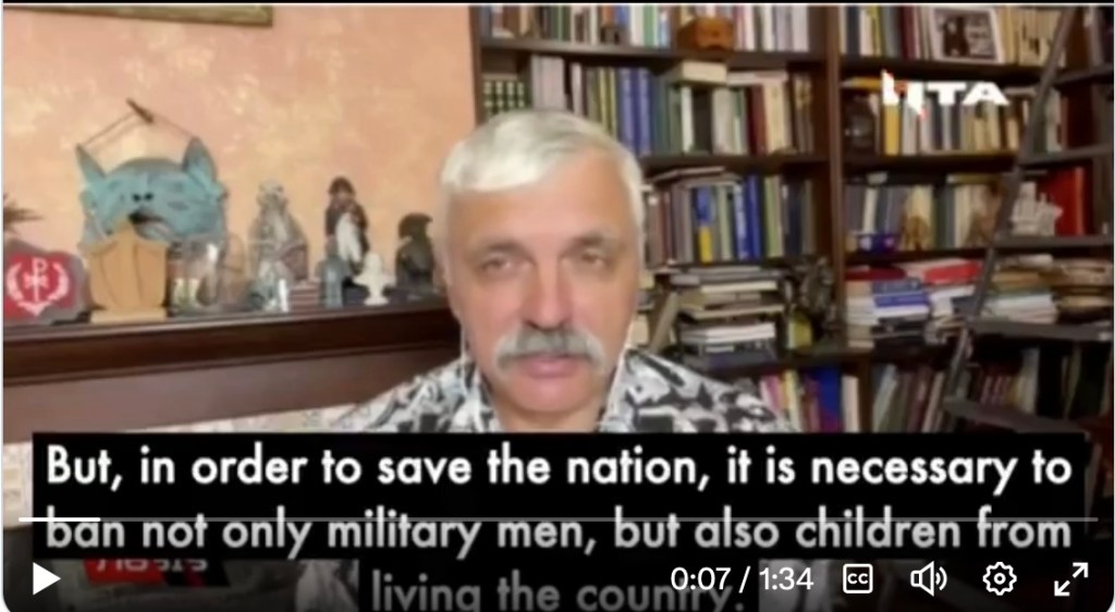 « Au nom de la survie de la nation, il est nécessaire d’interdire non seulement aux hommes astreints au service militaire de partir, mais aussi aux enfants. Nous comprenons que les enfants qui sont partis ne reviendront pas en Ukraine. Ils ne sont pas élevés par des Ukrainiens. Si quelqu’un ne comprend pas qu’il doit aimer l’Ukraine, alors nous l’obligerons à aimer l’Ukraine, qu’il le veuille ou non. Nous vous obligerons à rester ici, nous vous obligerons à vous battre ici ou à soutenir le front. Les enfants ukrainiens ne doivent pas entendre le polonais ou l’allemand lorsqu’ils communiquent. Ils doivent grandir au son de la sirène d’alerte aérienne. Ils doivent grandir ici, en Ukraine, et haïr leurs ennemis. Ils doivent assister aux funérailles de nos héros et à celles des victimes civiles. Ils doivent comprendre que la responsabilité de l’Ukraine leur incombera très bientôt, lorsque les générations précédentes mourront. »