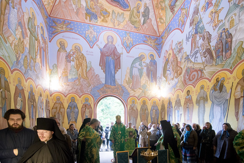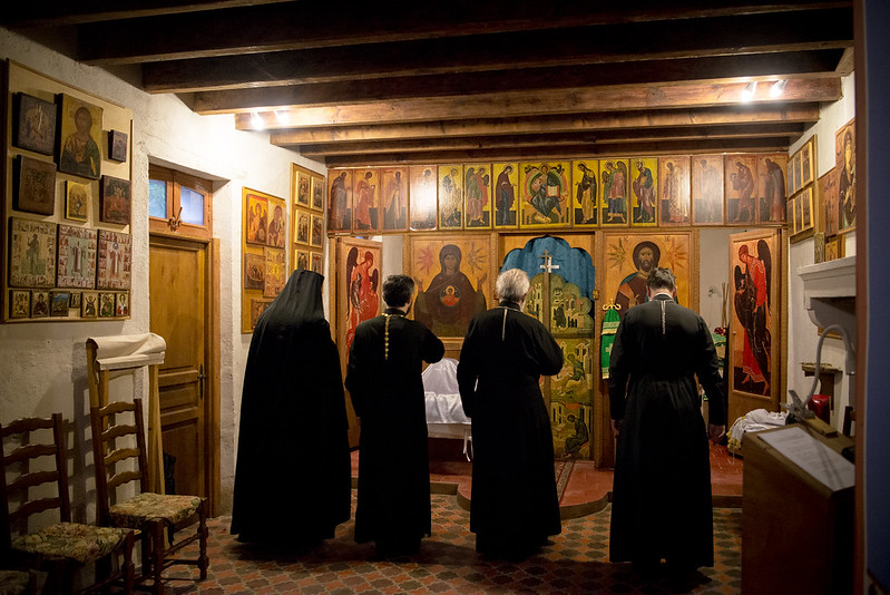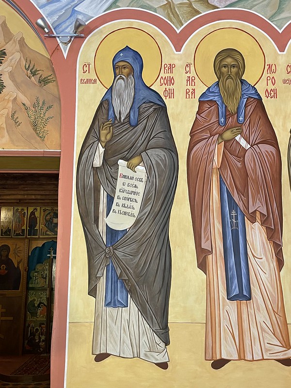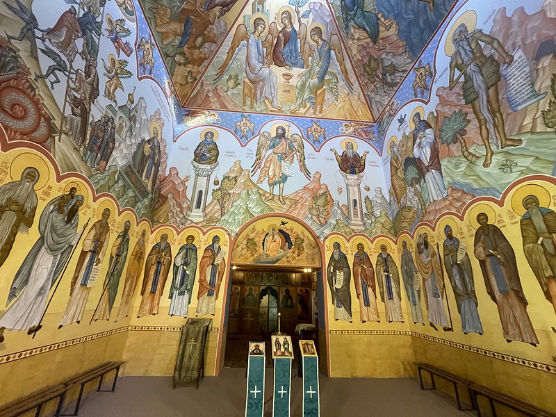 J’en parle aussi parce que les peintures sont remarquables. L’originalité est que dans la nef, de part et d’autre du prophète Elie il y a trente pères (et mères) du désert. L’ensemble des peintures est l’œuvre de l’iconographe russe Alexandre Belachov et de l’atelier des moniales.