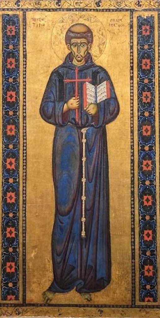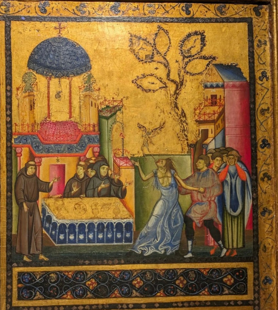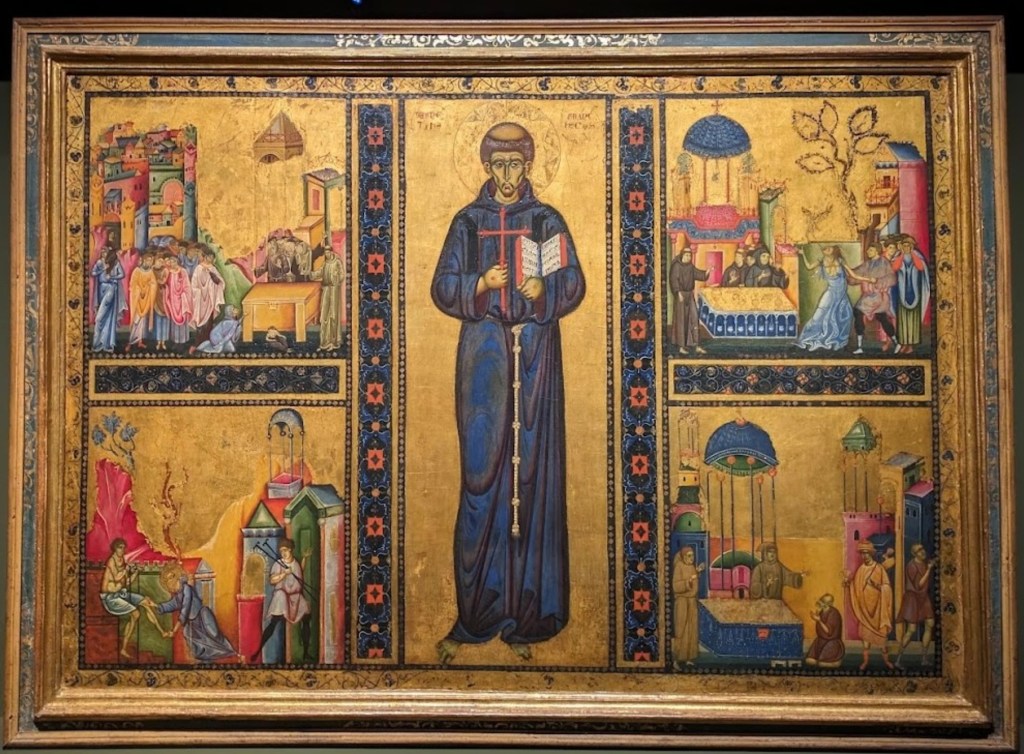 Cette peinture italienne du XIVe siècle est matériellement (tempera sur bois) et stylistiquement tributaire de l’art byzantin. Elle se trouve au musée du Trésor de la basilique d’Assise. Selon la tradition elle a été peinte sur la planche où fut lavé le corps de saint François après sa mort. D’où le choix des quatre scènes qui l’entourent : quatre miracles post-mortem (quatre guérisons dont un exorcisme). Au centre, saint François tient l’évangile, qui dit : « Si tu veux être parfait, va, vends ce que tu as et donne-le aux pauvres. »