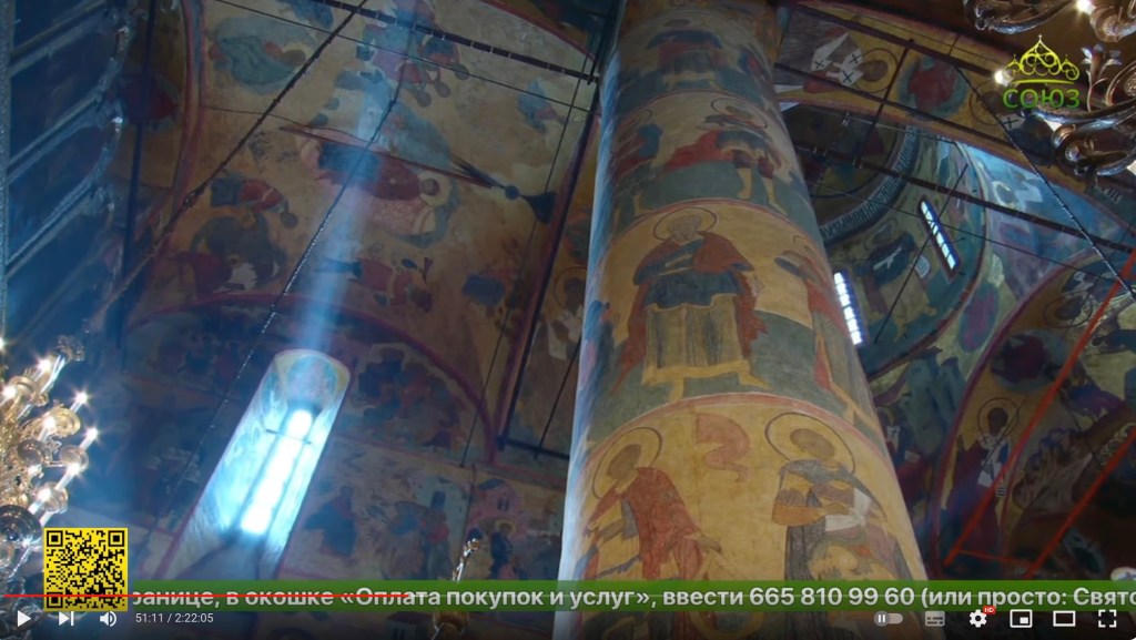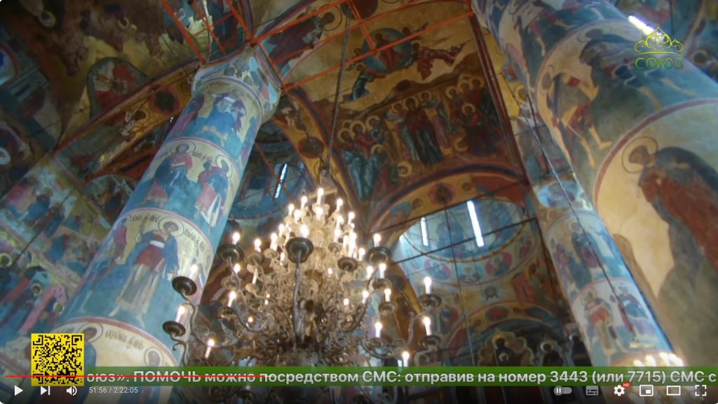 Dans le calendrier de l’Eglise orthodoxe russe c’est aujourd’hui la fête des saints métropolites de Moscou. Le patriarche Cyrille a célébré la divine liturgie à la cathédrale de la Dormition du Kremlin (la plus ancienne église de Moscou). C’est une occasion de voir de splendides images de la décoration de la catéhdrale, et aussi d’entendre un sublime hymne des chérubins, à 51’08. Ça commence sur cette image: