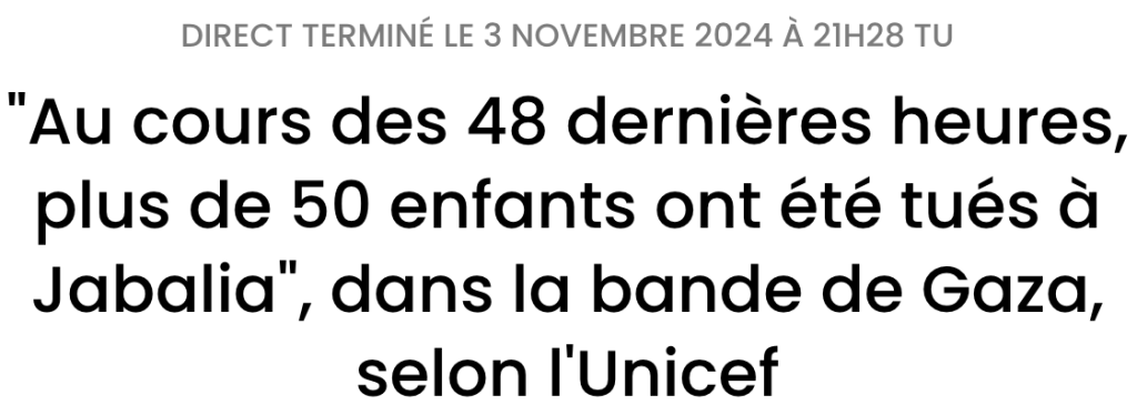 « Depuis le 7 octobre 2023, le bilan des pertes palestiniennes directes, liées aux opérations des forces israéliennes, largement soutenues par l’Occident otanien, s’alourdit tous les jours dans l’indifférence passive et coupable des gouvernances occidentales et d’une partie de l’opinion publique, anesthésiée par les médias mainstreams. Voici le bilan au 3 novembre 2024 midi :