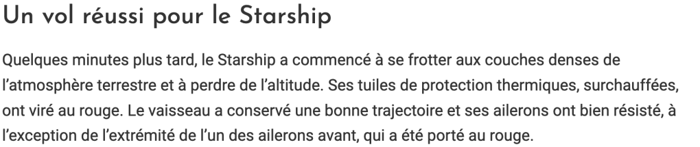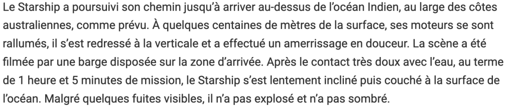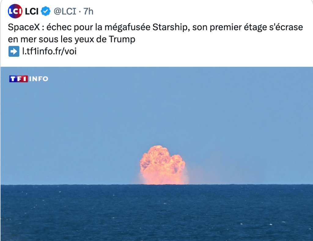 Contre Elon Musk et Donald Trump on peut tout se permettre. Ce n’est pas seulement la clique habituelle des fake news, LCI, BFM, etc., c’est la totalité des grands médias officiels qui se félicite bruyamment de « l’échec » de la mégafusée Starship d’Elon Musk qui s’est « écrasée en mer sous les yeux de Trump ».