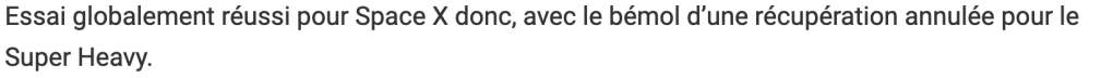 Mais les publications spécialisées soulignent au contraire la réussite de ce sixième essai, même si la fusée n’a pas pu être récupérée comme la dernière fois, ce qui n’était pas le but de cet essai :