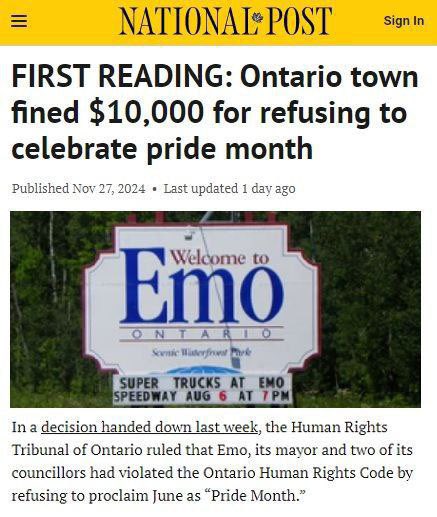 Le Tribunal des droits de l’homme de l’Ontario a jugé qu’Emo, son maire et deux de ses conseillers avaient violé le Code des droits de l’homme de l’Ontario en refusant de proclamer le mois de juin « Mois de la fierté ».