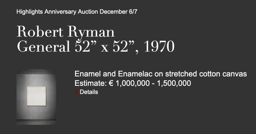 Je me dépêche de vous signaler que demain et après-demain est mis aux enchères à Berlin, à la maison Ketterer Kunst, un chef-d’œuvre du peintre américain Robert Ryman : « General 52cmx52cm ». C’est une laque blanche, réalisée en 1970.