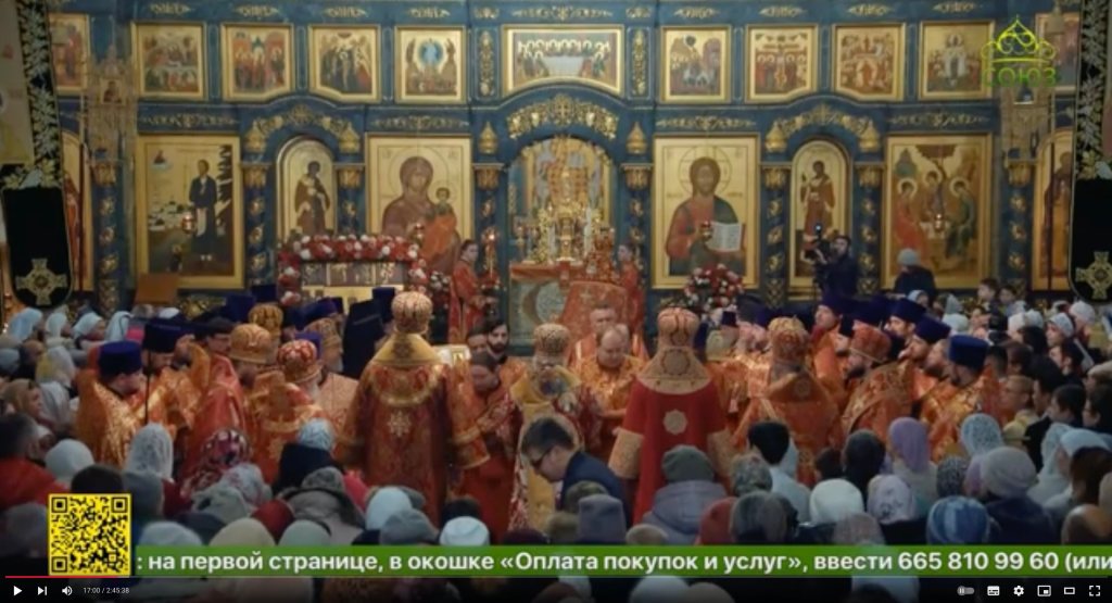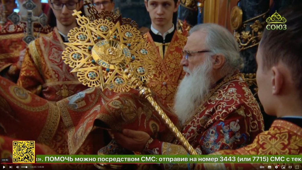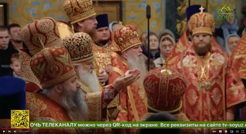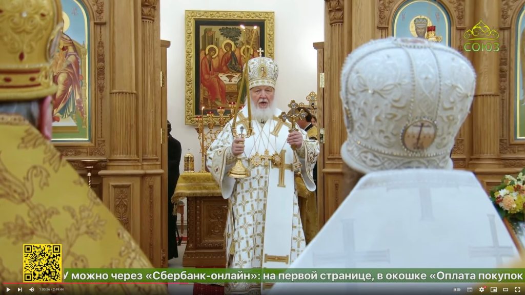 Le patriarche Cyrille ce matin, lors de la consécration d’une des 200 nouvelles églises de Moscou, et d’un nouvel évêque (en blanc, devant) :