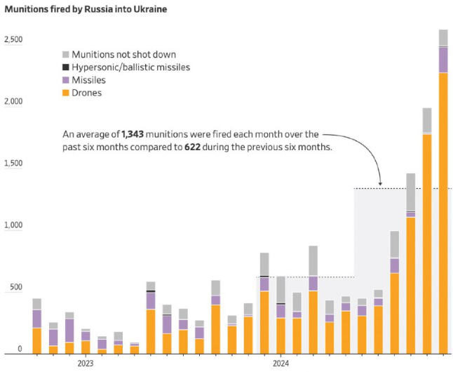 Le premier indique les frappes russes sur l’Ukraine. Ce n’est pas de la propagande russe, c’est du Wall Street Journal. On se rappellera que nos experts de plateaux affirmaient dès le printemps 2023 que les Russes n’avaient plus de munitions.