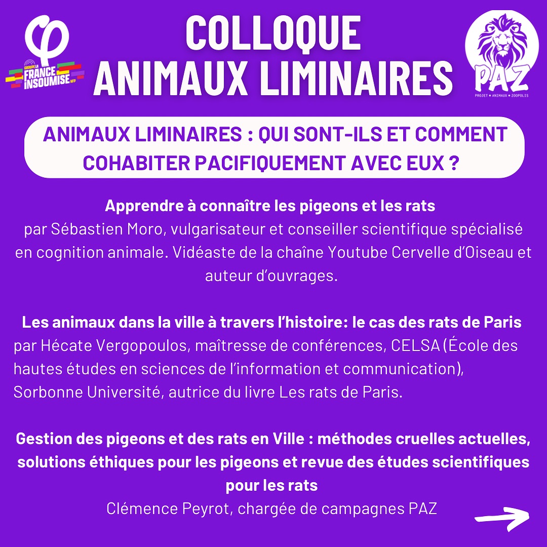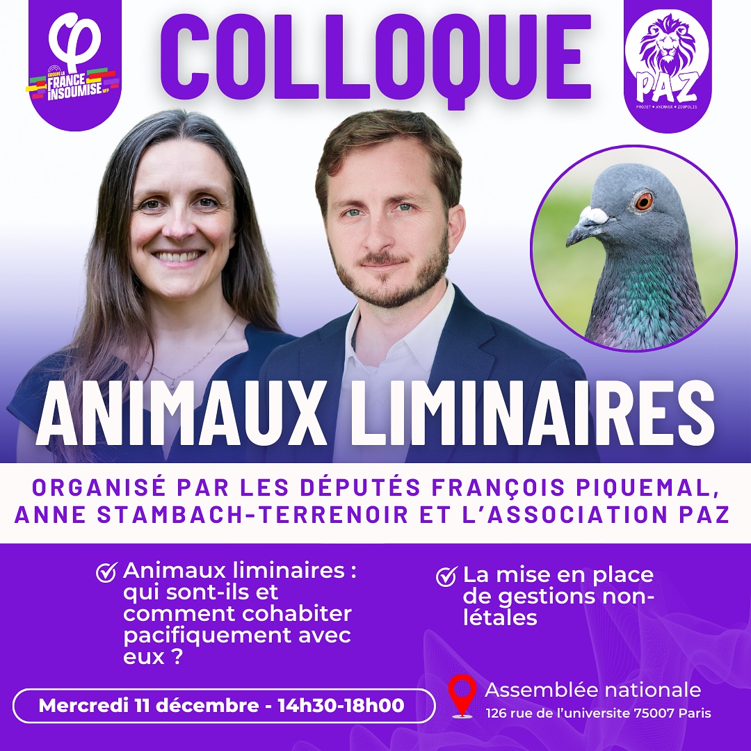 A l’issue du colloque, la foldingue LFI Ersilia Sourdais, député de Seinte-et-Marne, a « annoncé le dépôt d’une proposition de loi visant à créer la catégorie juridique des « animaux liminaires » et à interdire les méthodes léthales et cruelles à l’encontre des pigeons ».
