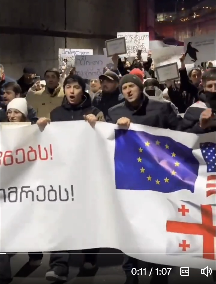 La manifestation de Tbilissi ce soir : le drapeau géorgien est sous les drapeaux de l’UE et des Etats-Unis…