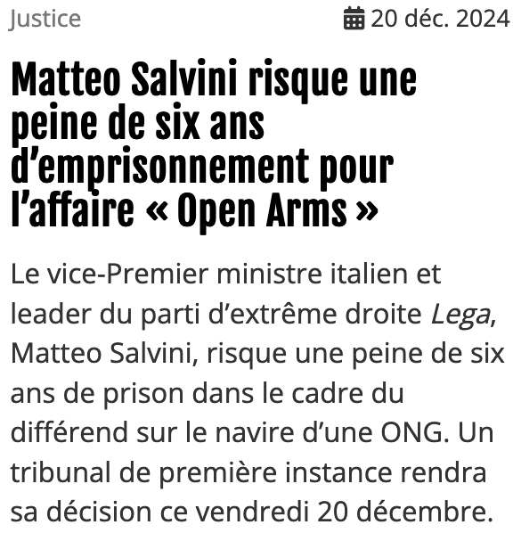 Le site européiste Euractiv se délectait déjà hier matin de voir Matteo Salvini condamné à six ans de prison pour avoir fait son travail de ministre de l’Intérieur, quand il avait refusé le débarquement d’un bateau des immigrationnistes d’Open Arms en août 2019.