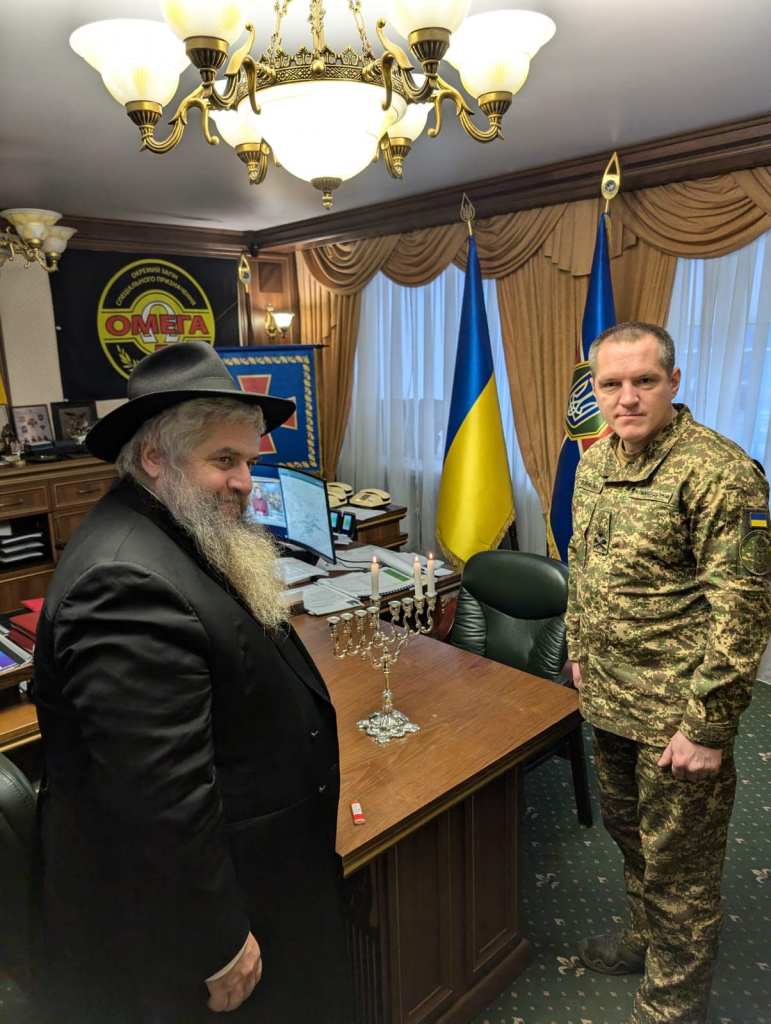 Le grand rabbin d’Ukraine a allumé sa ménorah de Hanouka avec le commandant de la Garde nationale Alexandre Pivenko, et a publié la photo sur Facebook.