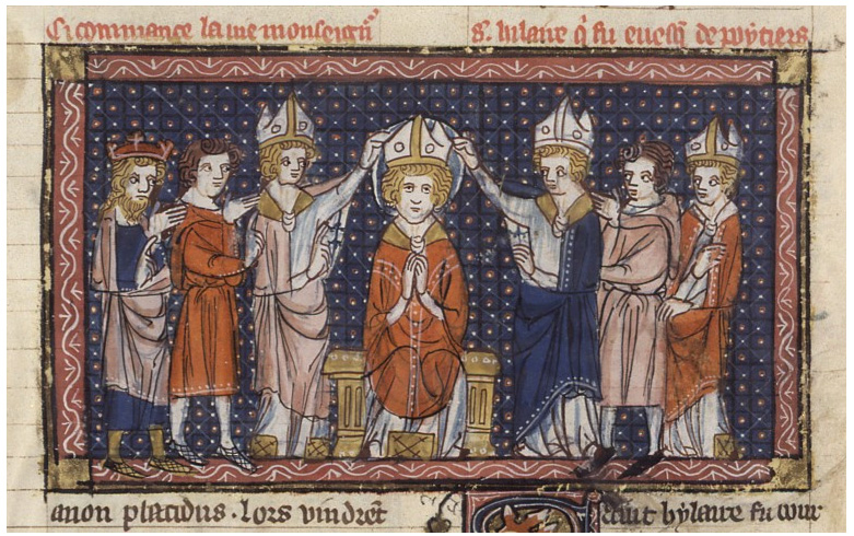 Fils d’un illustre patricien de la région de Poitiers (né vers 320), saint Hilaire fut élevé dans le paganisme ; mais son âme inquiète, sentant la nécessité d’un Dieu unique et éternel, restait insatisfaite de tous les systèmes de pensée et opinions qu’on lui proposait. Au cours de ses recherches et de ses lectures, il reçut les premières lueurs de la Vérité en lisant dans l’Ancien Testament le témoignage que Dieu se rend à lui-même : Je suis celui qui suis (Ex 3, 14). Il progressa encore dans la connaissance de Dieu, en reconnaissant que la beauté des créatures nous rend visible la beauté incompréhensible et combien plus élevée du Créateur. Mais ce n’est qu’en apprenant que le Verbe et Fils Unique de Dieu s’est fait chair pour nous libérer de la mort et que « par le Verbe fait chair, la chair peut monter jusqu’à Dieu le Verbe » que, parvenu au terme de sa recherche et débordant d’allégresse, il embrassa la doctrine de la Sainte Trinité et reçut la nouvelle naissance par le saint Baptême. Brûlant d’enthousiasme, il prêchait sans relâche la vraie foi, exhortait les païens à devenir chrétiens et les chrétiens à devenir des saints. Il convertit aussi son épouse, qui consentit à ne plus l’aimer que comme une fille spirituelle quand il devint prêtre, et persuada sa fille de préférer le mariage mystique avec le Christ à l’union terrestre.