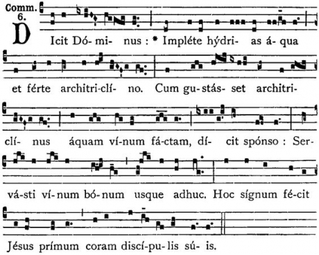 L’antienne de communion résume l’évangile des Noces de Cana, et la réaction du maître d’hôtel est plutôt pittoresque, avec une rare expressivité dans le plain chant : son étonnement, tout en haut du mode, comme en voix de fausset, montre son irritation de ne pas comprendre ce qui vient de se passer.