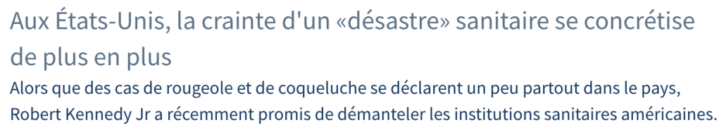 En bref, on a recensé 120 cas de rougeole au Texas, « une dizaine dans l’État voisin du Nouveau-Mexique et une poignée d’autres à travers le pays », ce qui laisse donc présager un « désastre sanitaire ». Cette terrifiante épidémie de rougeole, et la baisse des taux de vaccination dans tout le pays pour toutes les maladies, c’est de la faute de Robert Kennedy, qui est ministre depuis… 12 jours.