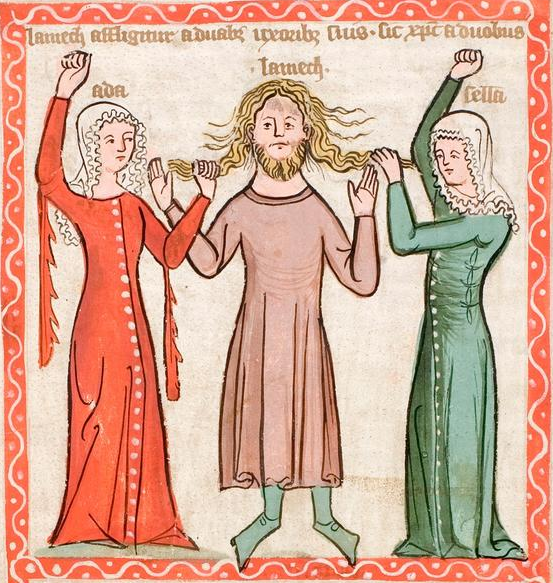 Lamech malmené par ses femmes, dans le Speculum Humanae Salvationis de Darmstadt. Plusieurs Bibles historiées montrent curieusement la scène supposant cette réaction des femmes à l’aveu par Lamech de ses meurtres…