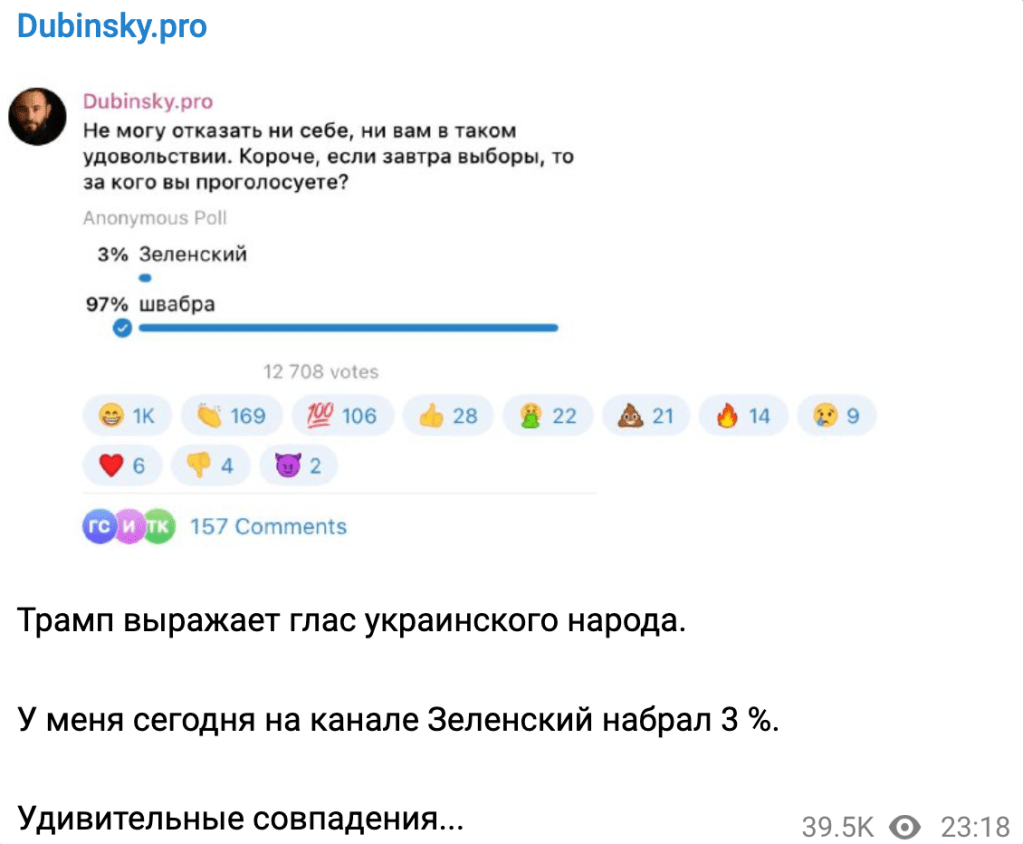 Le député ukrainien Oleksandr Doubinsky écrivait hier sur son fil Telegram (qui est en russe et non en ukrainien, soit dit en passant…) : « Je ne peux pas me refuser, ni vous refuser, un tel plaisir. En bref, s’il y a des élections demain, pour qui voterez-vous ? » Zelensky, ou une serpillère ? Résultat du sondage : 97% pour la serpillère, 3% pour Zelensky. Aujourd’hui Doubinsky commente : « Trump exprime la voix du peuple ukrainien. Sur mon fil, Zelensky a obtenu 3 %. Coïncidence étonnante… »