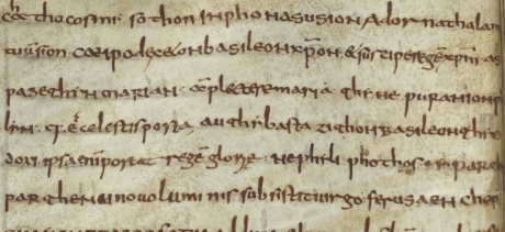 Chathacosmyso thon niphona su Sion Adorna thalamum tuum, Sion coe ipodexe ton basileon Christon et suscipe Regem Christum aspase thyn Mariam amplectere Mariam thyn epuranion phylyn quae est caelestis porta authy bastazi thon Basileon thys doxis ipsa enim portat regem gloria nephyli photos yparchy parthenos novo lumine subsistit Virgo ferusa en chersin Yon proeosforu adducens in manibus filium ante luciferum on labon Symeon en anchales autu quem accipiens Simeon in ulnis suis ekyrixen lais praedicavit populis despotyn authon ene Dominum eum esse Zois ce thanatu vitae et mortis ce Sothyra tu chosmu et salvatorem mundi