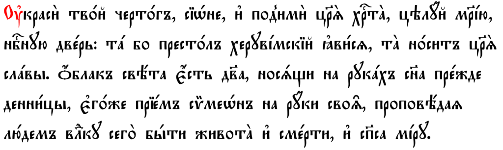 Κατακόσμησον τὸν νυμφῶνά σου Σιών, καὶ ὑπόδεξαι τὸν Βασιλέα Χριστόν, ἄσπασαι τὴν Μαριάμ, τὴν ἐπουράνιον πύλην· αὕτη γὰρ θρόνος Χερουβικὸς ἀνεδείχθη, αὕτη βαστάζει τὸν Βασιλέα τῆς δόξης, νεφέλη φωτὸς ὑπάρχει ἡ Παρθένος, φέρουσα ἐν σαρκὶ Υἱὸν πρὸ Ἑωσφόρου, ὃν λαβὼν Συμεὼν ἐν ἀγκάλαις αὐτοῦ ἐκήρυξε λαοῖς, Δεσπότην αὐτὸν εἶναι, ζωῆς καὶ τοῦ θανάτου, καὶ Σωτῆρα τοῦ κόσμου.