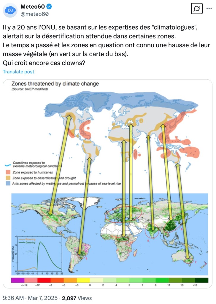 J’ai vérifié. C’est incontestable. Au détour d’un article d’un site de l’idéologie climatique obligatoire (de 2019, où figure la carte du bas), j’ai même lu que ce pourrait être grâce à la hausse du niveau de CO2…Mais il ne faut pas se réjouir de ce « verdissement », ajoute l’article. Car c’est souvent à cause de cultures qui pompent beaucoup d’eau dans des régions qui en ont peu. Heureusement que « la Science » a toujours une réponse aux erreurs précédentes de « la Science » pour appuyer le dogme intangible de « la Science ».