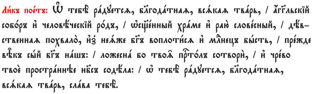 Ἐπi σοὶ χαίρει, Κεχαριτωμένη, πᾶσα ἡ κτίσις. Ἀγγέλων τὸ σύστημα καὶ ἀνθρώπων τὸ γένος, ἡγιασμένε ναὲ καὶ παράδεισε λογικέ, παρθενικὸν καύχημα, ἐξ ἧς Θεός ἐσαρκώθη καὶ παιδίον γέγονεν, ὁ πρὸ αἰώνων ὑπάρχων Θεὸς ἡμῶν· τὴν γὰρ σὴν μήτραν θρόνον ἐποίησε, καὶ τὴν σὴν γαστέρα πλατυτέραν οὐρανῶν ἀπειργάσατο. Ἐπὶ σοὶ χαίρει, Κεχαριτωμένη, πᾶσα ἡ κτίσις δόξα σοι.