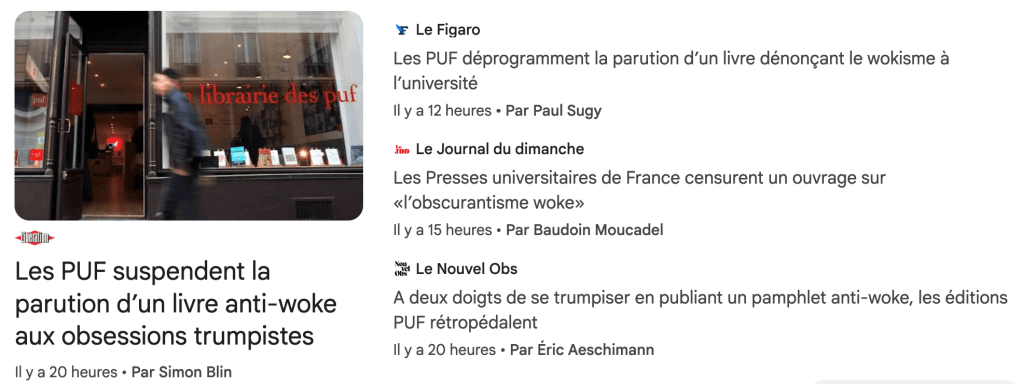 Il y a deux ans, les Presses universitaires de France avaient demandé à trois universitaires un livre critique sur le mouvement woke. L’essai, intitulé Face à l’obscurantisme woke, compilant une vingtaine de contributions, devait sortir ces jours-ci, et il était déjà proposé sur les sites de vente en ligne. Mais sa parution a été « suspendue ».
