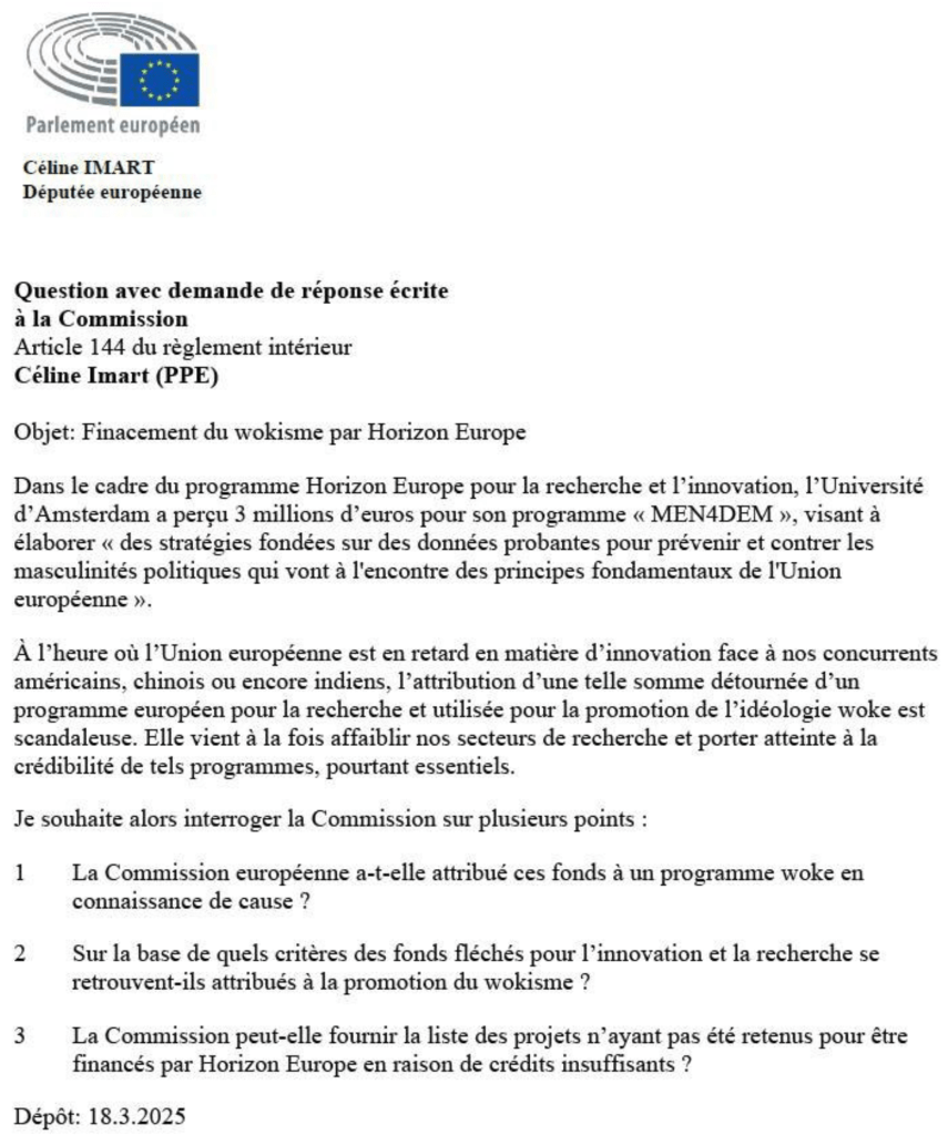 Lizza Mügge, professeureuh en sciences sociales et comportementales à l’université d’Amsterdam, spécialisée dans l’intersectionnalité, le genre, la diversité, le transnationalisme, est la « coordinatrice scientifique » du projet MEN4DEM (des hommes non masculins pour une démocratie châtrée), qui cible « les idéologies d’extrême droite souvent liées à la xénophobie, au racisme, à l’antisémitisme, à la misogynie, à l’homophobie, à la transphobie et, plus généralement, à l’hostilité envers les groupes marginalisés ». Le projet est chargé « d’élaborer des stratégies fondées sur des données probantes pour lutter contre les formes néfastes de masculinité politique » afin de « fournir des outils concrets aux décideurs politiques, aux praticiens, aux groupes de la société civile et aux partis politiques afin de créer un environnement politique plus sûr et plus inclusif pour tous ».