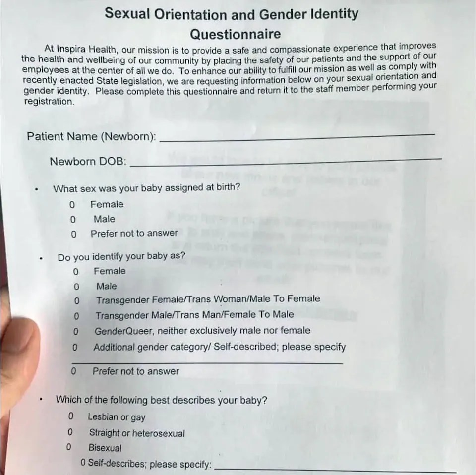 Inspira Health a quatre hôpitaux et huit centres de santé dans le New Jersey. Quand une mère vient faire soigner son bébé, elle doit remplir un « questionnaire sur l’orientation sexuelle et l’identité de genre » du bébé, auquel l’administration de l’hôpital s’adresse :