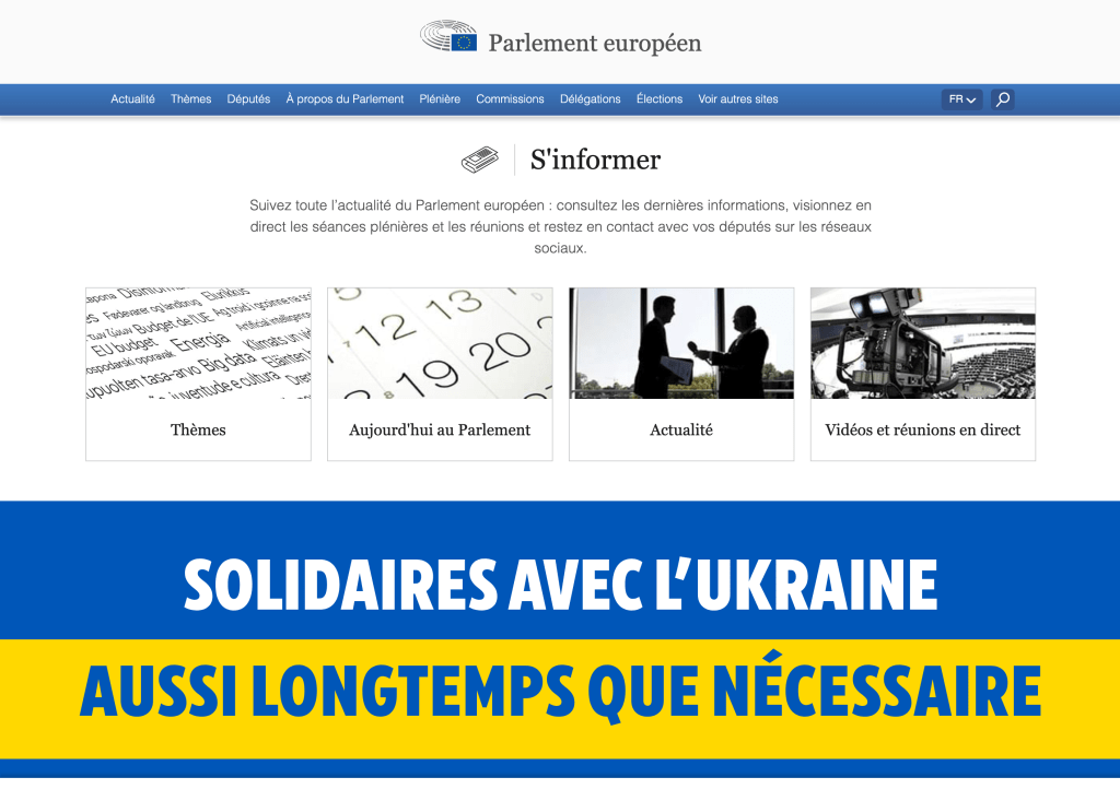 De même le Parlement européen a encore voté la semaine dernière deux résolutions hystériquement russophobes de soutien inconditionnel à l’Ukraine et de demande de militarisation à outrance de l’UE à cause de la trahison de Trump… La page d’accueil du Parlement européen est toujours celle-là :