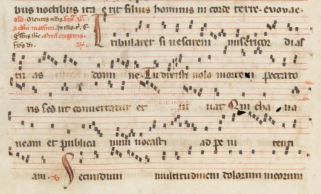 Les répons des matines de la semaine sont pris parmi ceux des matines du dimanche précédent (avant 1960 dans le bréviaire romain). Celui-ci tombe bien aujourd’hui, puisqu’il évoque la Chananéenne, que l’on trouve dans l’évangile. Peut-être est-ce pourquoi dans quelques anciens livres ce répons était spécifique du jeudi de la première semaine de carême, comme on le voit ici dans cet antiphonaire franciscain de la fin du XIIIe siècle :