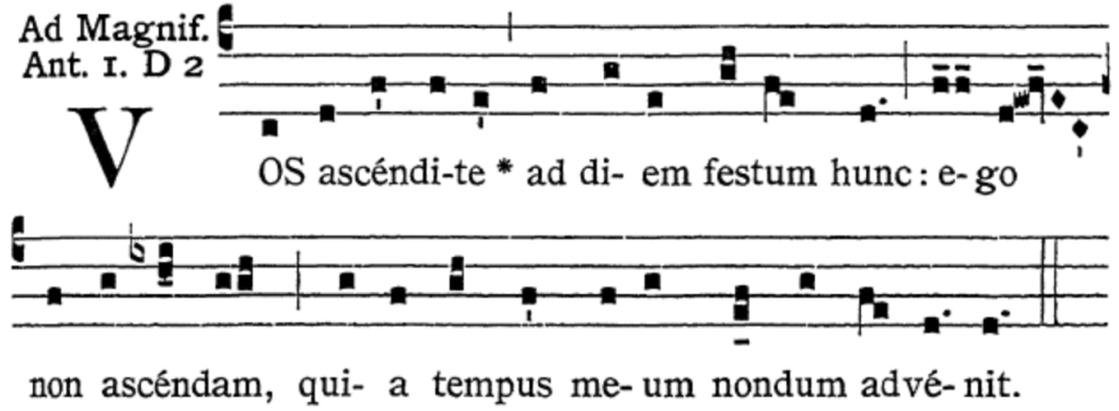 Sur le plan musical, ces deux antiennes sont des récitatifs sans surprise, sauf deux particularités parallèles. Celle du Benedictus insiste sur « vestrum », lourdement : votre triste temps terrestre, votre temps pénible, est toujours prêt. Celle du Magnificat insiste sur « ego », l’auto-affirmation de la divinité, par une double note doublement longue, suivie d’un mélisme se terminant pas l’une des révérences qui illustrent habituellement le nom du Seigneur. C’est un écho de l’« Ego Sum », Je Suis, qui ponctue l’évangile de saint Jean.