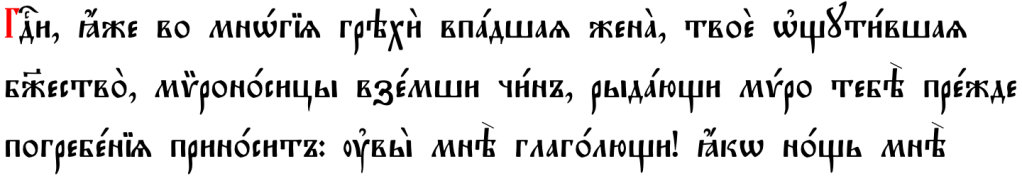 Κύριε, ἡ ἐν πολλαῖς ἁμαρτίαις περιπεσοῦσα γυνή, τὴν σὴν αἰσθομένη Θεότητα, μυροφόρου ἀναλαβοῦσα τάξιν, ὀδυρομένη μύρα σοι, πρὸ τοῦ ἐνταφιασμοῦ κομίζει. Οἴμοι! λέγουσα, ὅτι νύξ μοι, ὑπάρχει, οἶστρος ἀκολασίας, ζοφώδης τε καὶ ἀσέληνος, ἔρως τῆς ἁμαρτίας. Δέξαι μου τὰς πηγὰς τῶν δακρύων, ὁ νεφέλαις διεξάγων τῆς θαλάσσης τὸ ὕδωρ· κάμφθητί μοι πρὸς τοὺς στεναγμοὺς τῆς καρδίας, ὁ κλίνας τοὺς οὐρανούς, τῇ ἀφάτῳ σου κενώσει· καταφιλήσω τοὺς ἀχράντους σου πόδας, ἀποσμήξω τούτους δὲ πάλιν, τοῖς τῆς κεφαλῆς μου βοστρύχοις, ὧν ἐν τῷ Παραδείσῳ Εὔα τὸ δειλινόν, κρότον τοῖς ὠσὶν ἠχηθεῖσα, τῷ φόβῳ ἐκρύβη. Ἁμαρτιῶν μου τὰ πλήθη καὶ κριμάτων σου ἀβύσσους, τίς ἐξιχνιάσει ψυχοσῶστα Σωτήρ μου; Μή με τὴν σὴν δούλην παρίδῃς, ὁ ἀμέτρητον ἔχων τὸ ἔλεος.