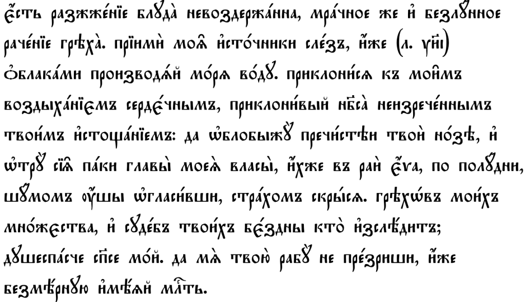 Seigneur, la femme qui était tombée dans une multitude de péchés, ayant reconnu votre divinité, prit le rôle d’une myrophore et, tout en larmes, vous offrit du parfum avant votre sépulture et dit : Malheur à moi ! La tyrannie de la débauche et la passion du péché m’ont fait sombrer dans une nuit noire. Recevez donc les flots de mes larmes, vous qui attirez les eaux de la mer dans les nuages, et penchez-vous sur les sanglots de mon cœur, vous qui abaissez les cieux par votre indicible abaissement. J’embrasse et je sèche, avec les boucles de mes cheveux, vos pieds immaculés…