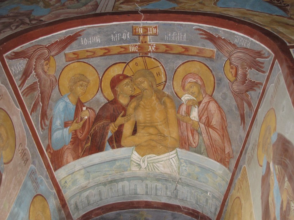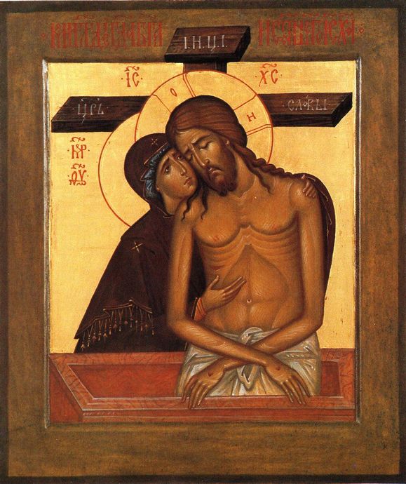 L’icône qu’on voit sur cette vidéo est l’icône russe dont le nom est « Ne pleure pas sur moi, Mère ». On voit Jésus au tombeau, mort (les yeux fermés) mais debout, consolant sa Mère, avec la croix en arrière-plan. C’est manifestement une adaptation orientale de la Pietà.