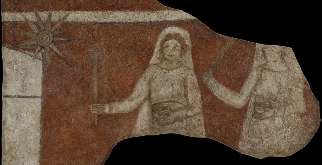 Dans la « domus ecclesiae » de Doura Europos, où se trouvent les plus anciennes fresques chrétiennes conservées (241), deux femmes portant des torches et des récipients sont ce qui reste d’un double cortège de cinq femmes convergeant vers un bâtiment. On en a fait des myrophores, mais il est clair qu’il s’agit des vierges folles et des vierges sages, même si elles portent des torches et non des lampes. Et ce sont ces vierges portant des torches que chante Romanos : les vierges sages qui figurent les apôtres réveillés par la myrophore… Et nous tous sommes à Pâques ces vierges sages, comme le chante la liturgie byzantine dans le canon pascal, qu’on doit à saint Jean Damascène :