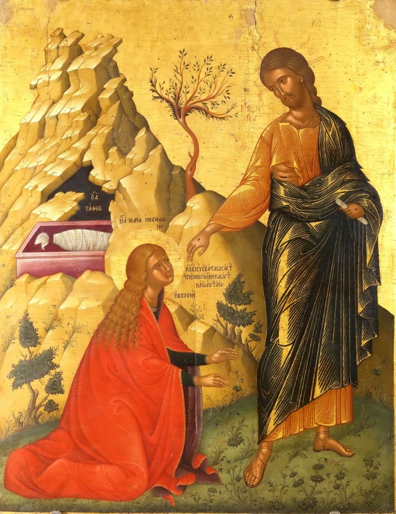 L’évangile de ce jour est celui du « noli me tangere » (Μή μου ἅπτου), expression aujourd’hui défigurée dans sa traduction et son interprétation. saint Romanos le Mélode (VIe siècle), dans sa première hymne de Pâques, centrée sur Marie Madeleine, l’interprète, strophe 11, comme tous les pères de l’Eglise, selon sa signification obvie. (Traduction de José Grosdidier de Matons, Sources chrétiennes.)
