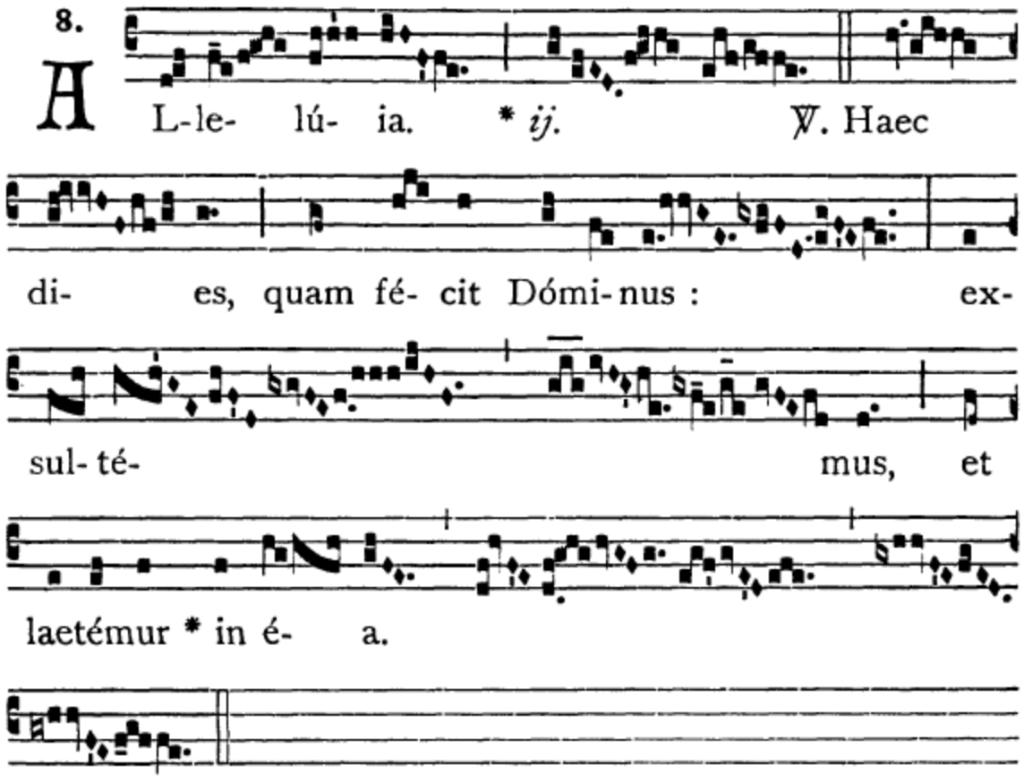 A partir de ce jour le graduel est remplacé par un alléluia. Aujourd’hui le texte est celui de l’antienne de graduel des jours précédents : Haec dies… La mélodie se rencontre plusieurs fois dans l’année, dès le premier dimanche de l’Avent. Ici elle est pleinement en relation avec le texte, avec la longue révérence sur Dominus, et la jubilation sur exsultemus puis à la fin : c’est le jour en lequel nous nous réjouissons.