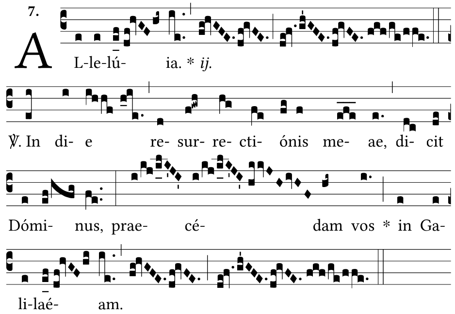 Le premier reprend ce qu’avait dit le Christ à ses apôtres au mont des Oliviers avant la Passion : « Postquam autem resurrexero praecedam vos in Galileam », et que l’ange rappelle aux myrophores dans le tombeau vide. La mélodie souligne fortement « praecedam », tout en haut du mode : le Christ précèdera ses apôtres dans la Galilée des nations, c’est lui qui évangélisera.