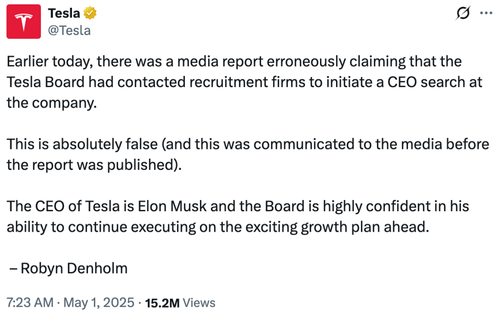 « Plus tôt dans la journée, un article a été publié dans les médias affirmant à tort que le conseil d’administration de Tesla avait contacté des cabinets de recrutement afin de lancer une recherche pour un nouveau PDG au sein de l’entreprise. Cela est absolument faux (et cela a été communiqué aux médias avant la publication de l’article). Le PDG de Tesla est Elon Musk et le conseil d’administration a pleinement confiance en sa capacité à poursuivre la mise en œuvre du plan de croissance ambitieux qui attend l’entreprise. – Robyn Denholm »