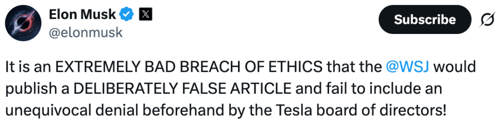 « C’est une VIOLATION GRAVE DE L’ÉTHIQUE que le Wall Street Journal publie un ARTICLE FAUX et omette de mentionner le démenti sans équivoque du conseil d’administration de Tesla ! »