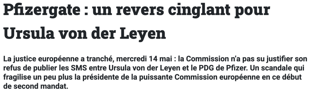 La Cour de Justice de l’UE donne raison au New York Times contre la Commission européenne qui refusait de communiquer les SMS entre Ursula von der Leyen et le PDG de Pfizer Albert Bourla, concernant le contrat de 35 milliards d’euros pour la livraison du poison anti-covid aux Etats membres de l’UE.