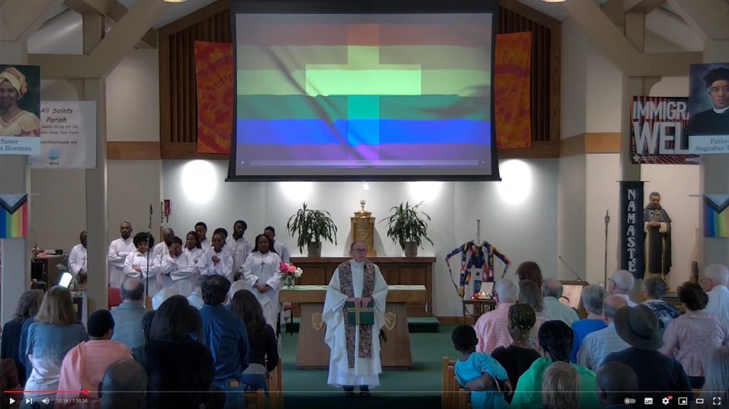 La messe se trouve intégralement sur YouYube. On peut voir à gauche le drapeau LGBT, à droite le panneau « Immigrants Welcome », et aussi une banderole « Namasté ». C’est « bonjour » en hindi, et c’est ainsi que le prêtre commence la célébration, avant de rappeler que « nous sommes sur le territoire de la nation Onondaga ». Et il y aura des chants en swahili… Le panneau « Immigrants Welcome » est à moitié caché par le portrait du Père Augustus Tolton, le premier prêtre noir américain, et lui fait pendant à gauche le portrait de la franciscaine Thea Bowman, créatrice d’une « musique liturgique » spécifique pour les noirs américains… A droite de l’autel il y a une sorte de mémorial indien avec des lumignons devant, mais il n’y a pas de crucifix. Juste sur l’écran la croix du drapeau LGBT.