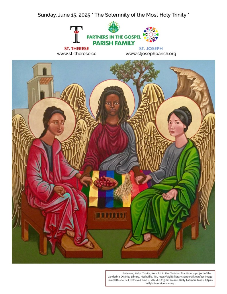 Cette horreur blasphématoire LGBT qui est une atroce parodie de l’icône des icônes d’André Roublev orne la couverture du dernier bulletin de la paroisse Saint-Joseph de Seattle, pour la « solennité de la Très Sainte Trinité ».